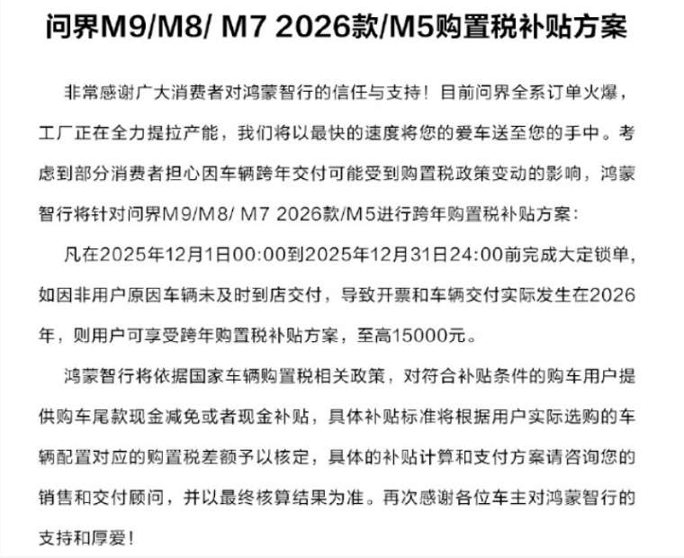 “软”的一手是补贴承诺,稳定用户预期。自10月下旬起,包括小米、蔚来、理想、奇瑞、长安等在内的主流品牌纷纷宣布“兜底”政策。核心条款高度一致:最晚在12月31日前锁单,若因厂家原因导致车辆在2026年开票,由此产生的购置税差价由车企补足,单车最高补贴1.5万元。
