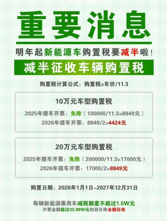 从2026年开始,消费者购买新能源汽车需缴纳的购置税将从目前的0%变为减半征收,单车最高减免额从3万元降至1.5万元,这意味着元旦后再购车将最多支出1.5万元现金成本。