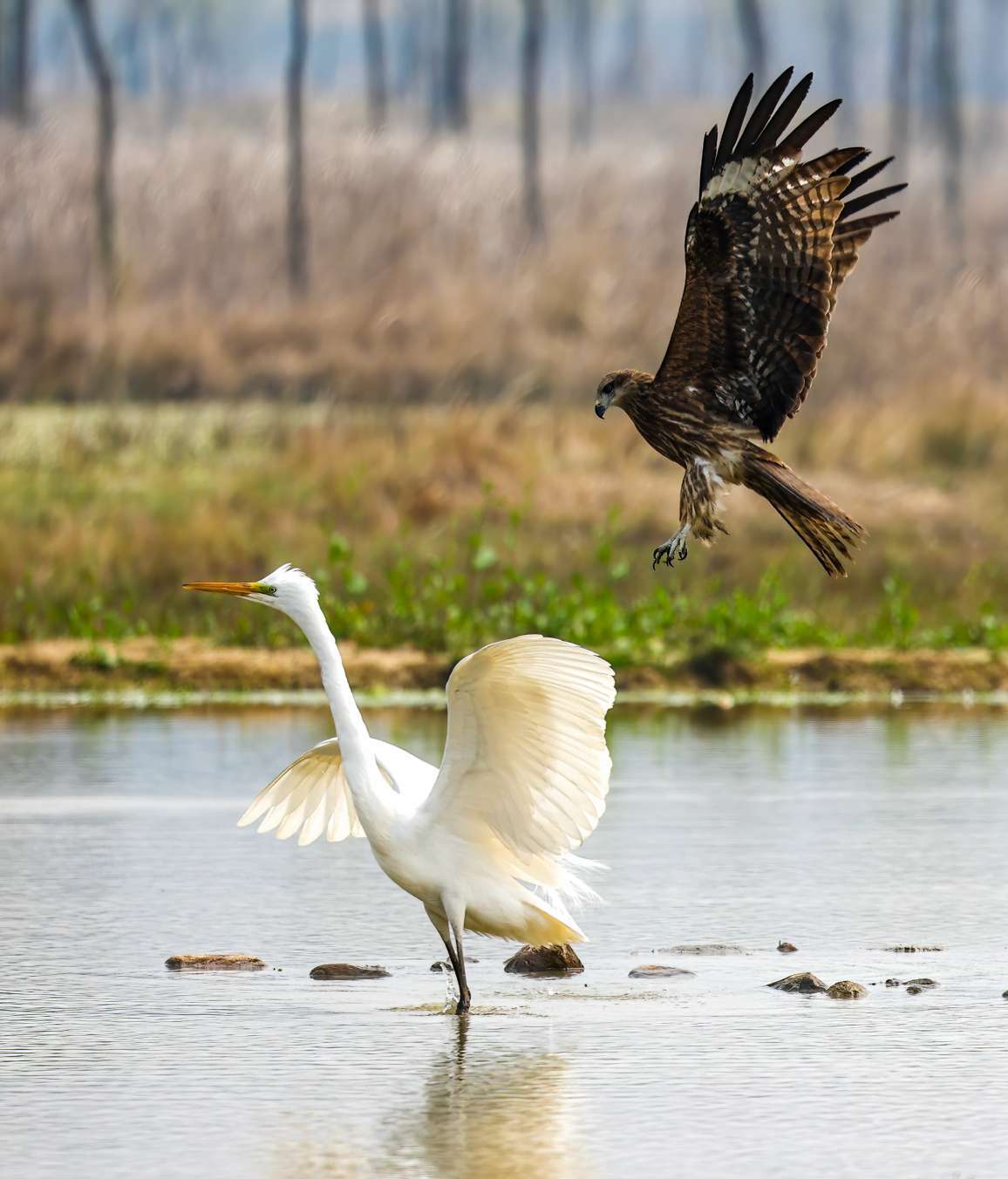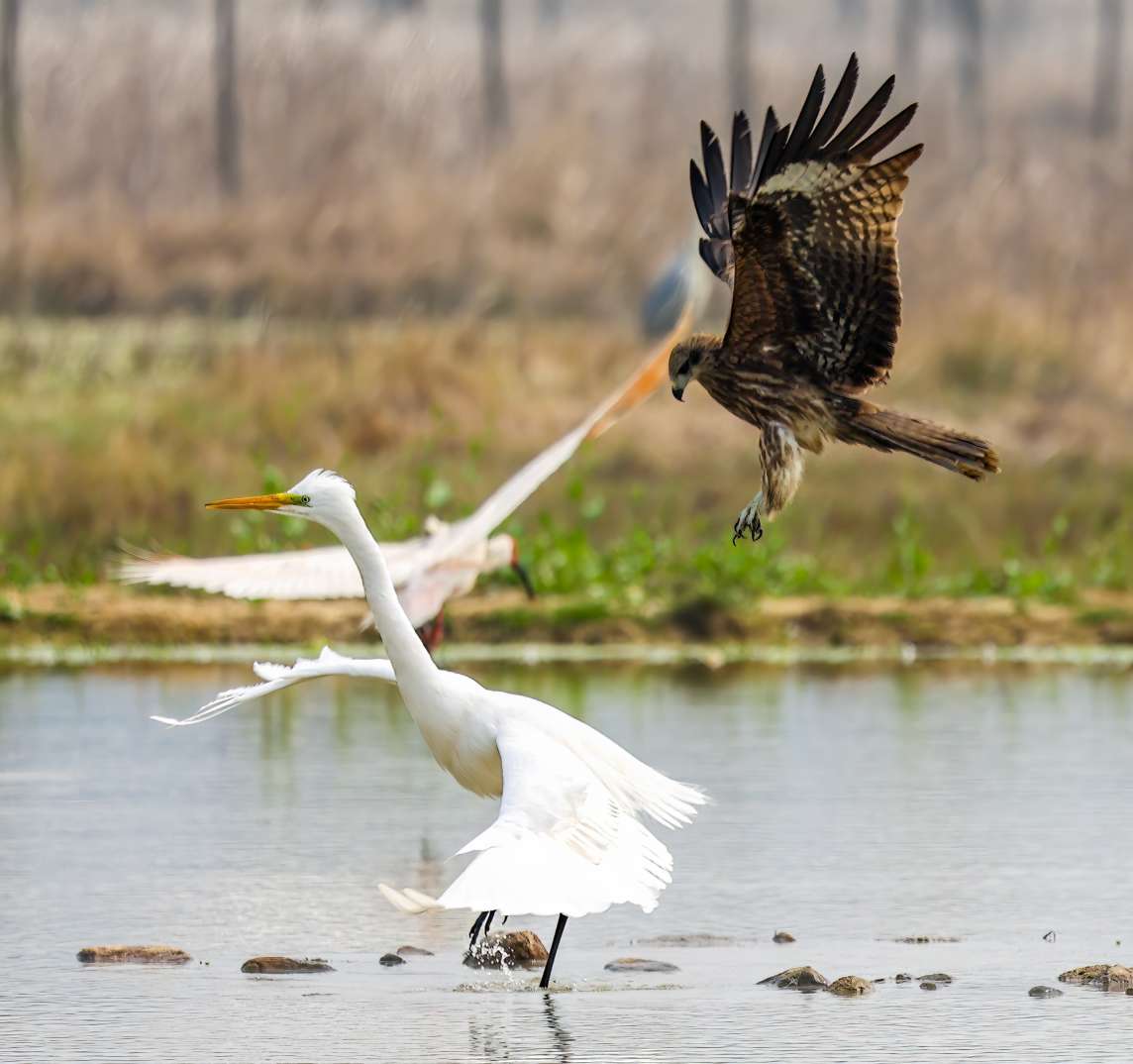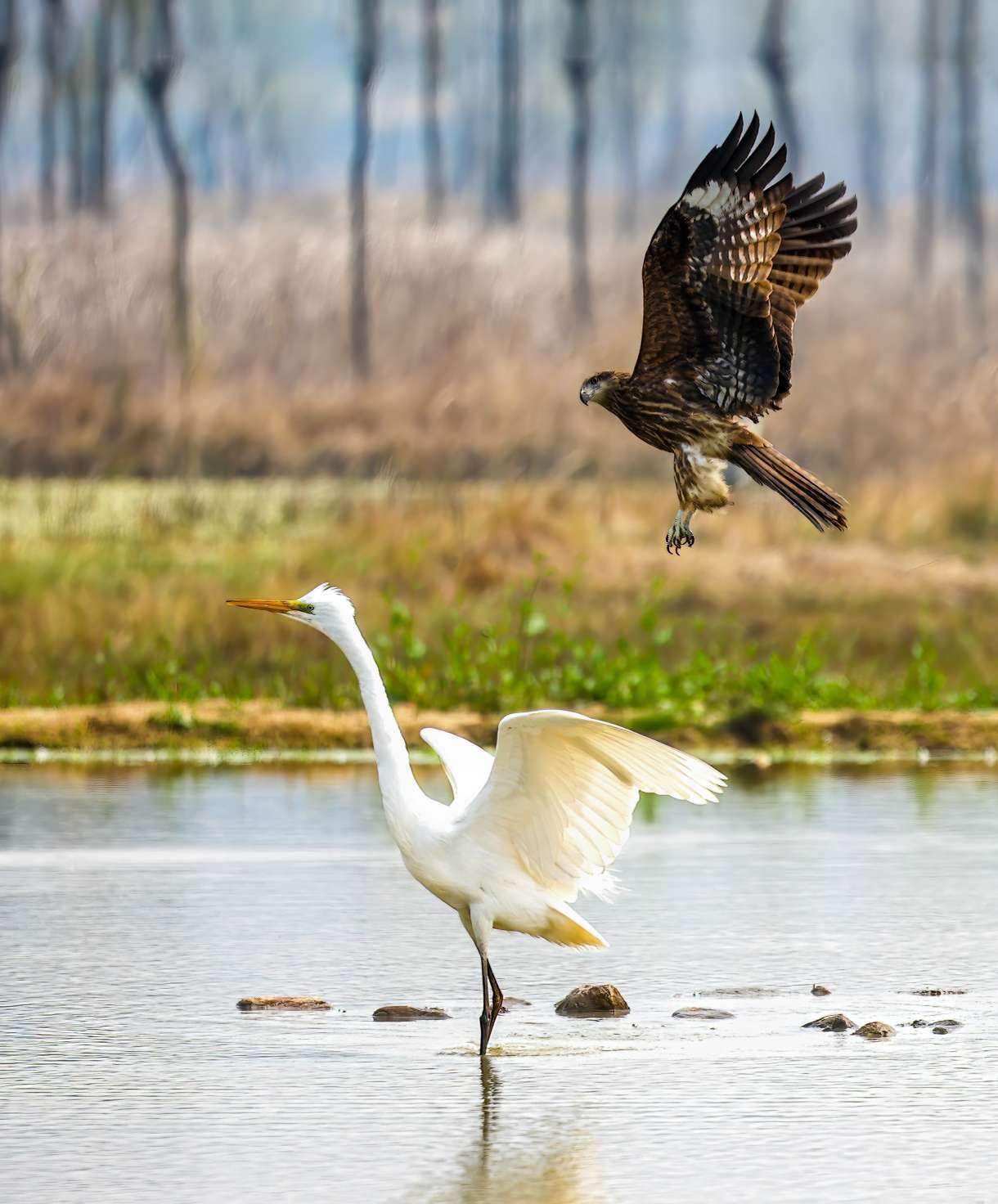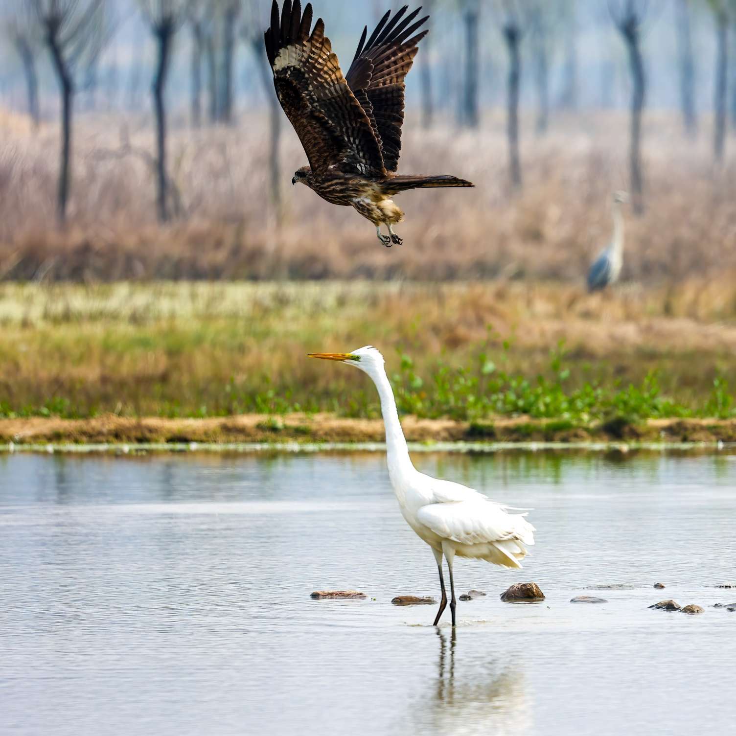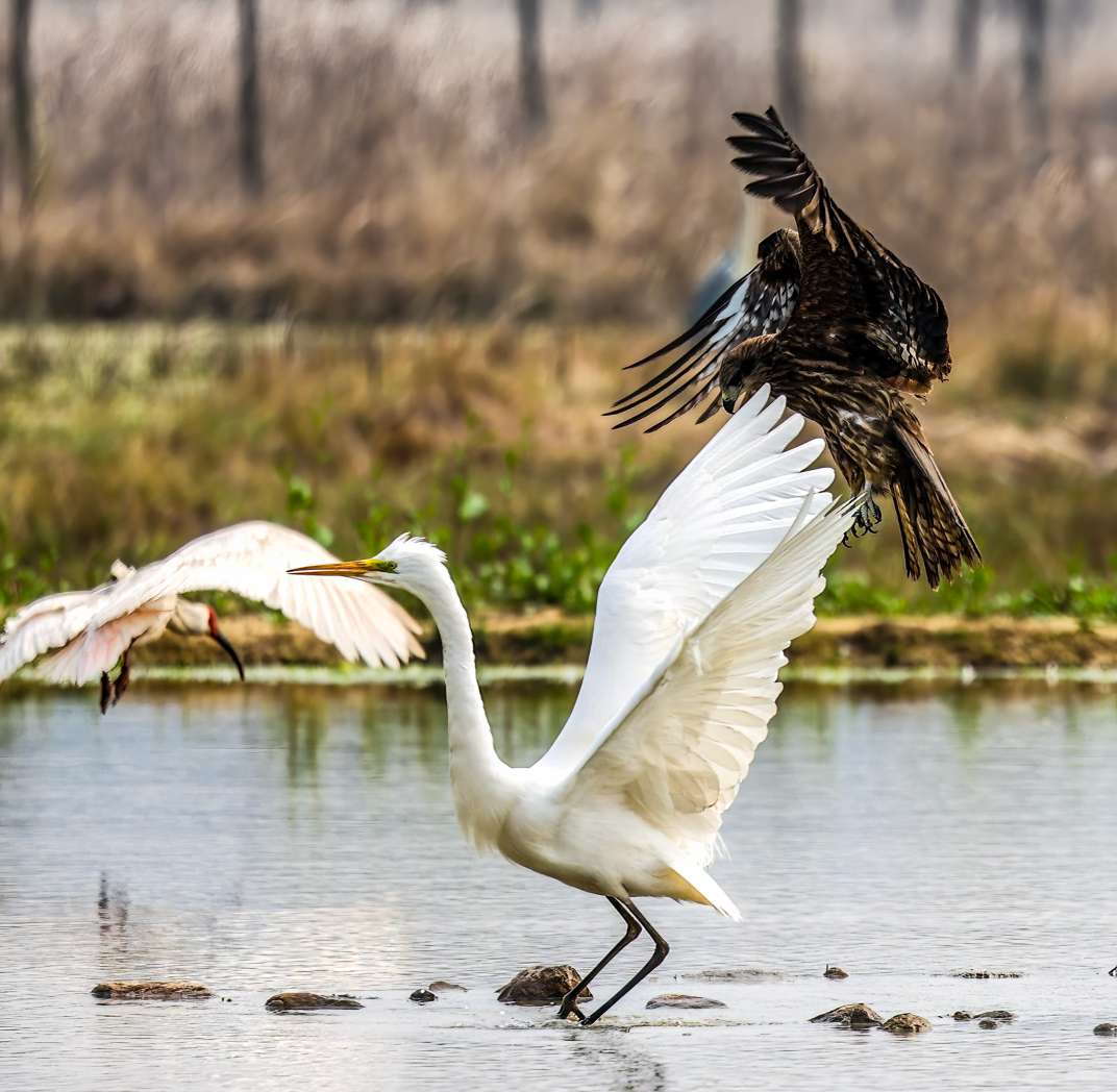 白鹭:优雅的防御者,白鹭体态修长,常栖息湿地,以鱼虾为食,繁殖期护雏本能极强。白鹭虽非猛禽对手,但善于利用水域环境隐蔽,并可能呼唤群体支援。白鹭“智斗”黑鸢的胜利,本质是母性本能与生态智慧的结合,在力量悬殊中开辟生路,它们诠释了自然界的永恒主题——生存从来仰赖勇气与策略,而非强权。