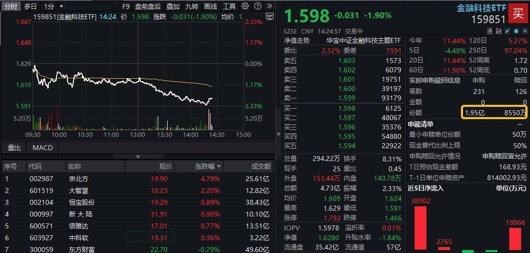 7月2日,金融科技午后跌幅扩大至2%,前期热门题材情绪降温,概念股普遍走低。截至发文,楚天龙跌停,翠微股份大跌逾8%,拉卡拉、天阳科技、东信和平等多股跌超3%,仅京北方等6股逆市飘红。热门ETF方面,金融科技ETF(159851)午后场内下探逾2%,成交额超4.7亿元股票配资导航网,盘中频现溢价,资金净申购超1亿份。